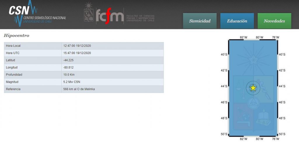 Este sábado se registró un sismo de mediana intensidad en la región de Aysén, específicamente a 566 km al O de Melinka.