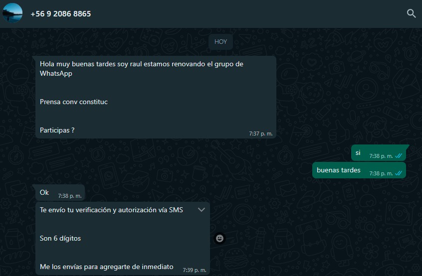 Al aceptar participar de esta renovación, el usuario recibirá un SMS en su dispositivo móvil con un código. “Tu cuenta de WhatsApp Bussines está siendo registrada en un dispositivo nuevo. No compartas el código. Código de WhatsApp Bussines XXXX“. Al entregar estos dígitos, la víctima estaría perdiendo los mensajes y contactos.