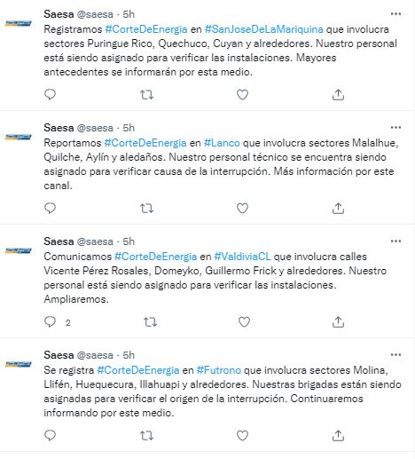 La empresa Saesa, en tanto, ha reportado diversos cortes en distintas comunas del sur del país.