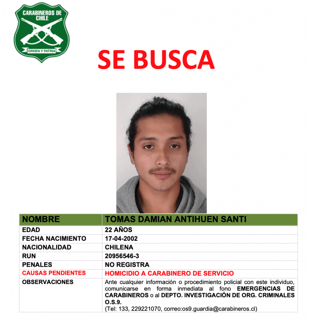 De esta forma, detallan que se trata de un hombre de 22 años, de nacionalidad chilena que ya está siendo buscado activamente por el delito de “homicidio a carabinero de servicio”.