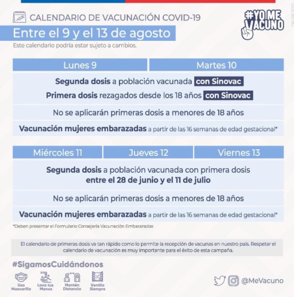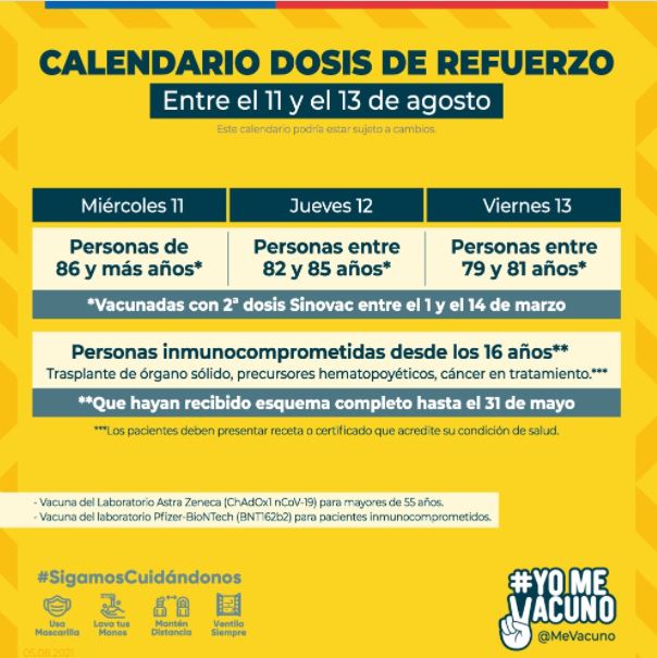 El miércoles 11 de agosto le corresponderá la vacuna a personas de 86 años y más vacunadas con Coronavac, el jueves 12 a las personas entre 82 y 85 años y el viernes 13, entre 79 y 81 años.