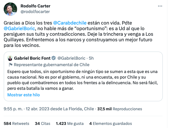 “Gracias a Dios los tres carabineros están con vida. Presidente Gabriel Boric no hable más de ‘oportunismo’: es a usted al que lo persiguen sus tuits y contradicciones“, declaró el jefe comunal.