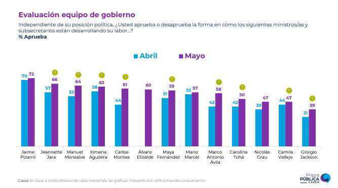Luego se ubican Maya Fernández (59%, +8pts), Mario Marcel (57%, +2pts), Marco Antonio Ávila (56%, +14pts) y Carolina Tohá (50%, +8pts).