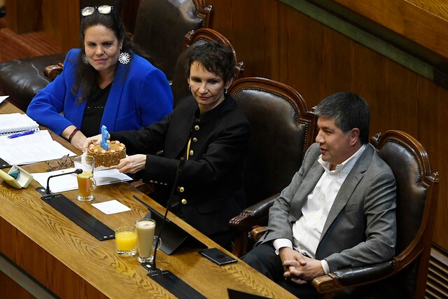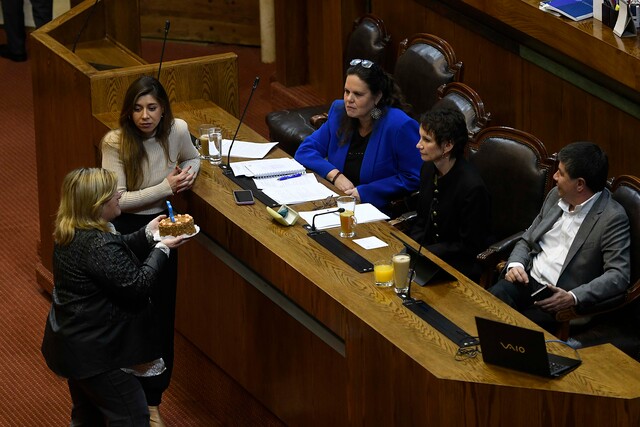 La diputada Gloria Naveillan entregó una torta con una vela con el número 1 a la ministra del Interior, Carolina Tohá, por el año que se cumple del Estado de Excepción en la macrozona sur.