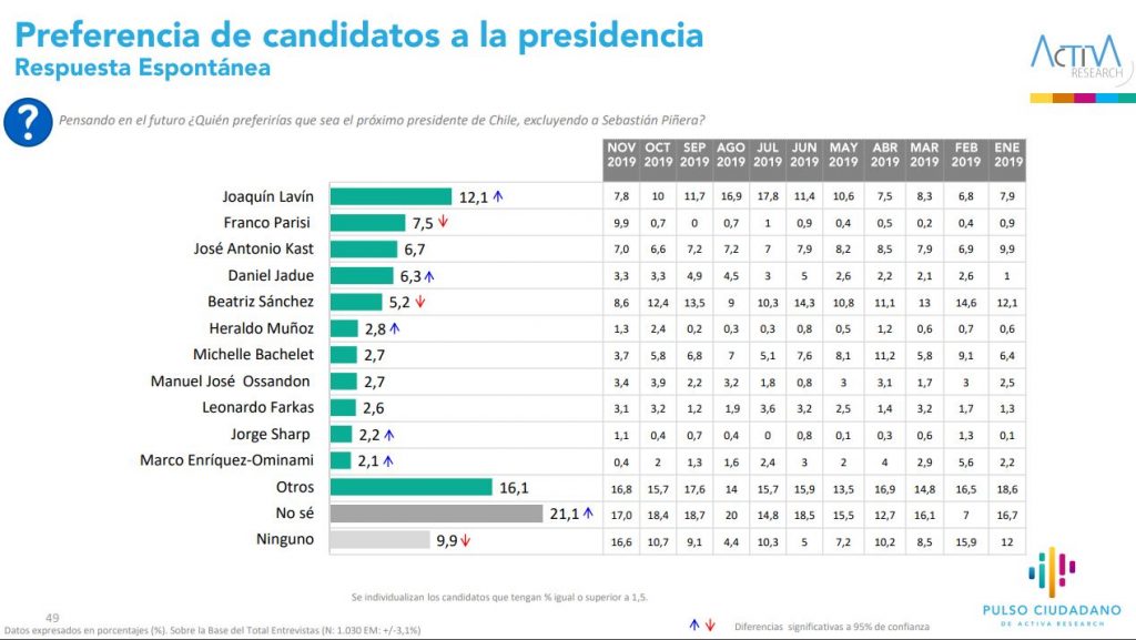 Con respecto a las elecciones presidenciales de 2021, al consultar de forma espontánea a los encuestados ¿quién preferirías que sea el próximo presidente? (excluyendo al actual); un 12,1% menciona a Joaquín Lavín, un 7,5% a Franco Parisi, un 6,7% a José Antonio Kast, un 6,3% a Daniel Jadue y un 5,2% a Beatriz Sánchez (Otros 16,1%, No sé 21,1% y Ninguno 9,9%%).