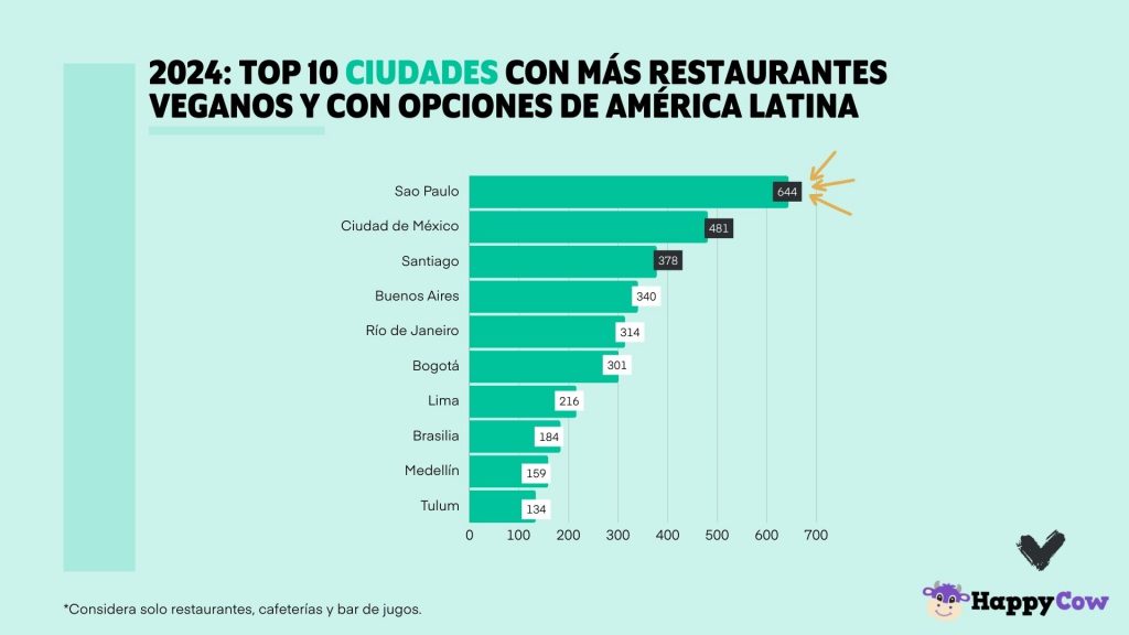 El informe, basado en datos de HappyCow hasta septiembre de 2024, incluyó restaurantes, cafeterías y bares de jugos, excluyendo otros servicios como tiendas veganas o catering.