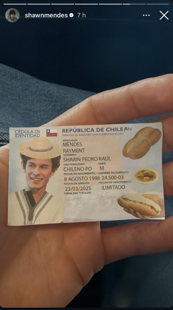 Pero eso no fue todo, ya que Mendes también causó furor en sus redes sociales al compartir una historia en Instagram, en la que mostró un carnet falso con su foto y algunos elementos típicos chilenos, como un completo y una marraqueta. Esta publicación causó mucha simpatía entre sus fans, quienes se mostraron encantados con el gesto del artista.