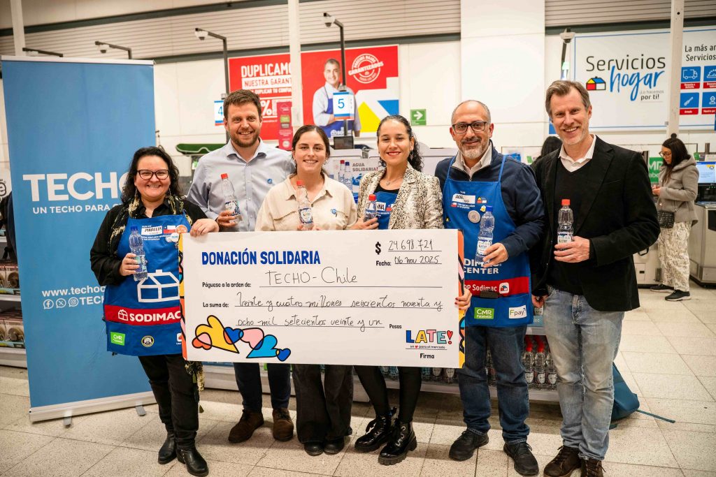 Sodimac y Late! entregaron a TECHO-Chile un valioso aporte anual generado por las compras solidarias de sus clientes de agua Late! Los fondos recaudados permitirán construir viviendas transitorias y definitivas para familias que viven en campamentos y necesitan un hogar.
